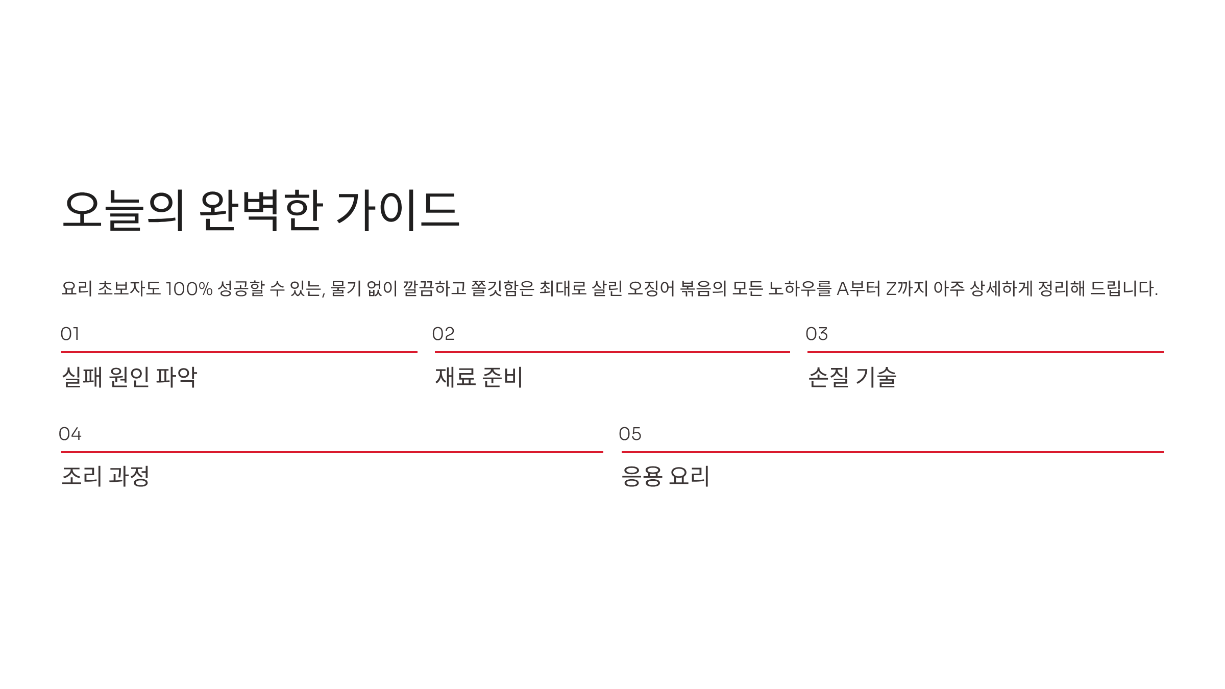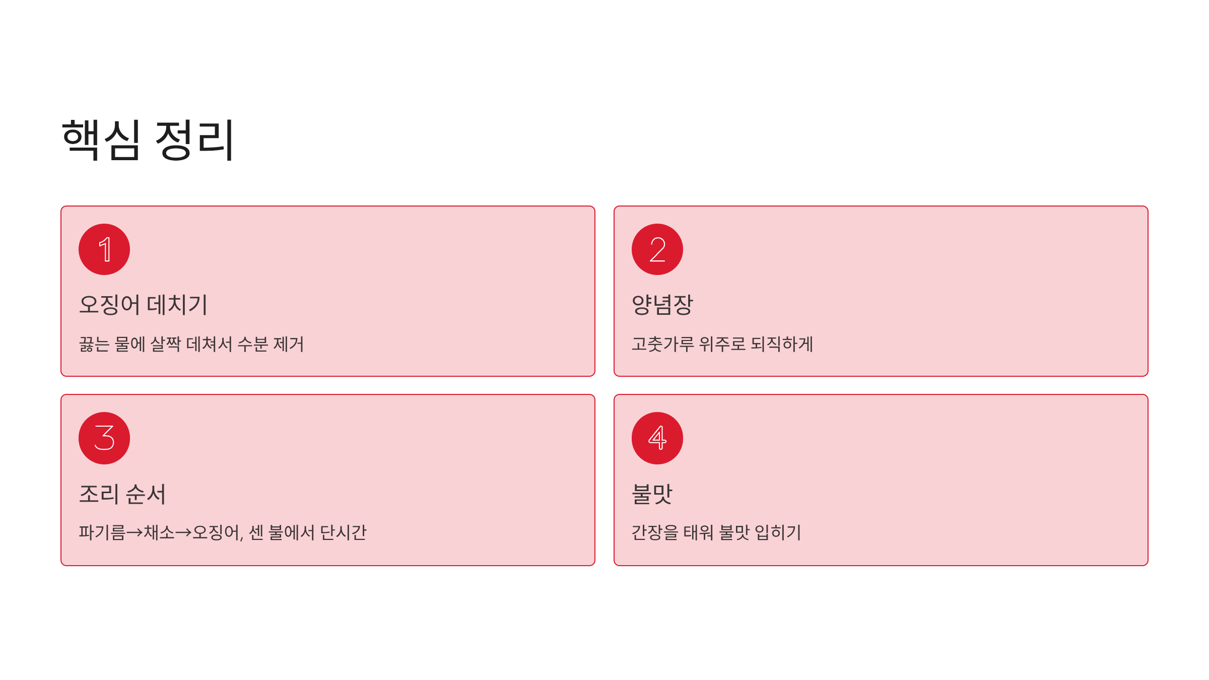 오늘 알려드린 레시피의 핵심을 다시 한번 정리해 보겠습니다. 첫째, 오징어는 끓는 물에 살짝 데쳐서 수분을 제거한다. 둘째, 양념장은 고춧가루 위주로 되직하게 만든다. 셋째, 파기름에 채소를 먼저 볶고 오징어를 넣어 센 불에서 단시간에 볶아낸다. 넷째, 간장을 태워 불맛을 입힌다.