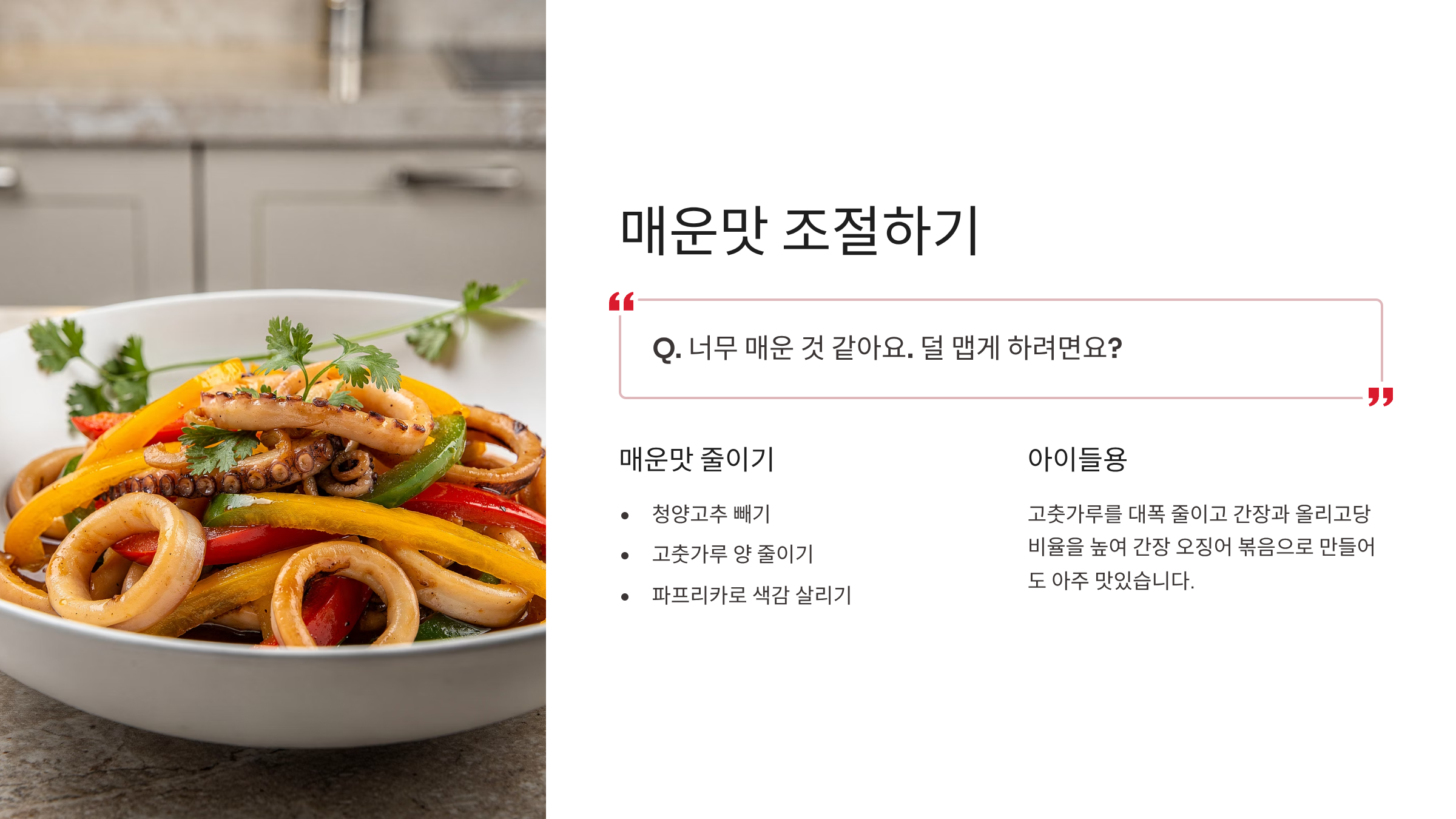 A. 매운맛을 줄이고 싶다면 청양고추를 빼고, 고춧가루의 양을 줄이세요. 대신 파프리카를 넣으면 색감은 살리면서 맵지 않고 달큰한 맛을 낼 수 있습니다. 아이들이 먹을 경우에는 고춧가루를 대폭 줄이고 간장과 올리고당 비율을 높여 간장 오징어 볶음으로 만드셔도 아주 맛있습니다.