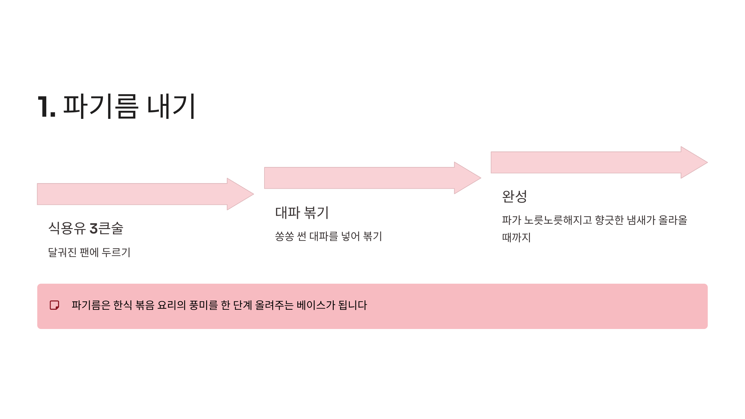 달궈진 팬에 식용유 3큰술을 두르고 쏭쏭 썬 대파를 넣어 볶습니다. 파가 노릇노릇해지고 향긋한 파 기름 냄새가 올라올 때까지 충분히 볶아주세요. 파기름은 한식 볶음 요리의 풍미를 한 단계 올려주는 베이스가 됩니다.