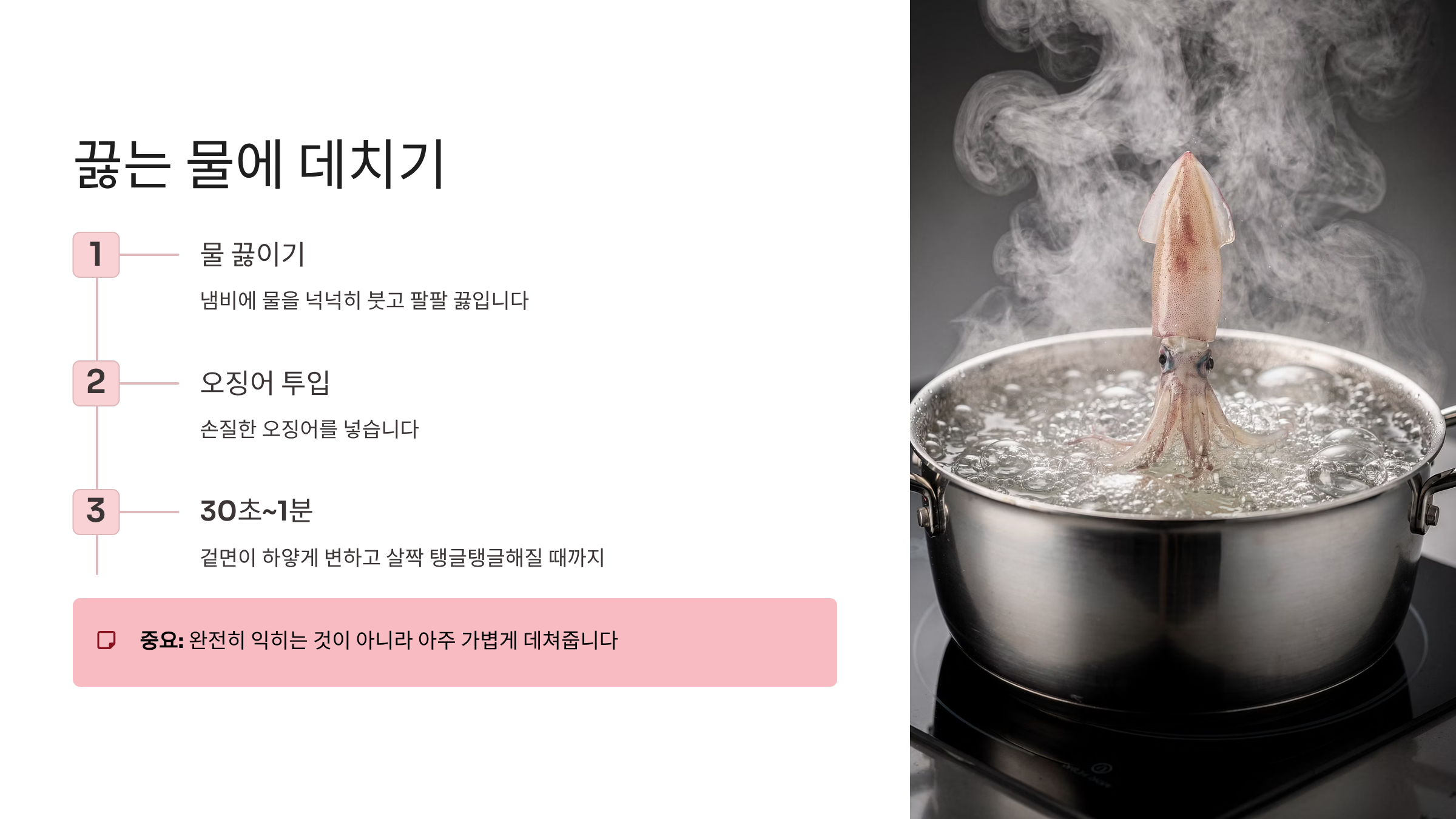 냄비에 물을 넉넉히 붓고 팔팔 끓입니다. 물이 끓으면 손질한 오징어를 넣습니다. 이때 완전히 익히는 것이 아니라 겉면이 하얗게 변하고 살짝 탱글탱글해질 때까지만, 약 30초에서 1분 정도만 아주 가볍게 데쳐줍니다.