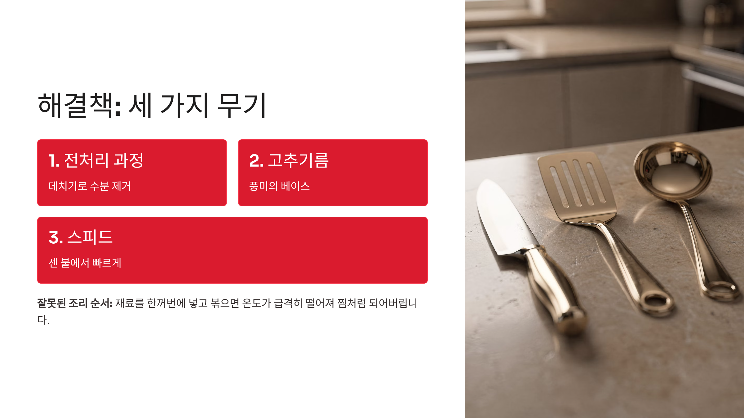 이 문제들을 해결하기 위해 우리는 전처리 과정(데치기)과 고추기름, 그리고 스피드라는 세 가지 무기를 사용할 것입니다.