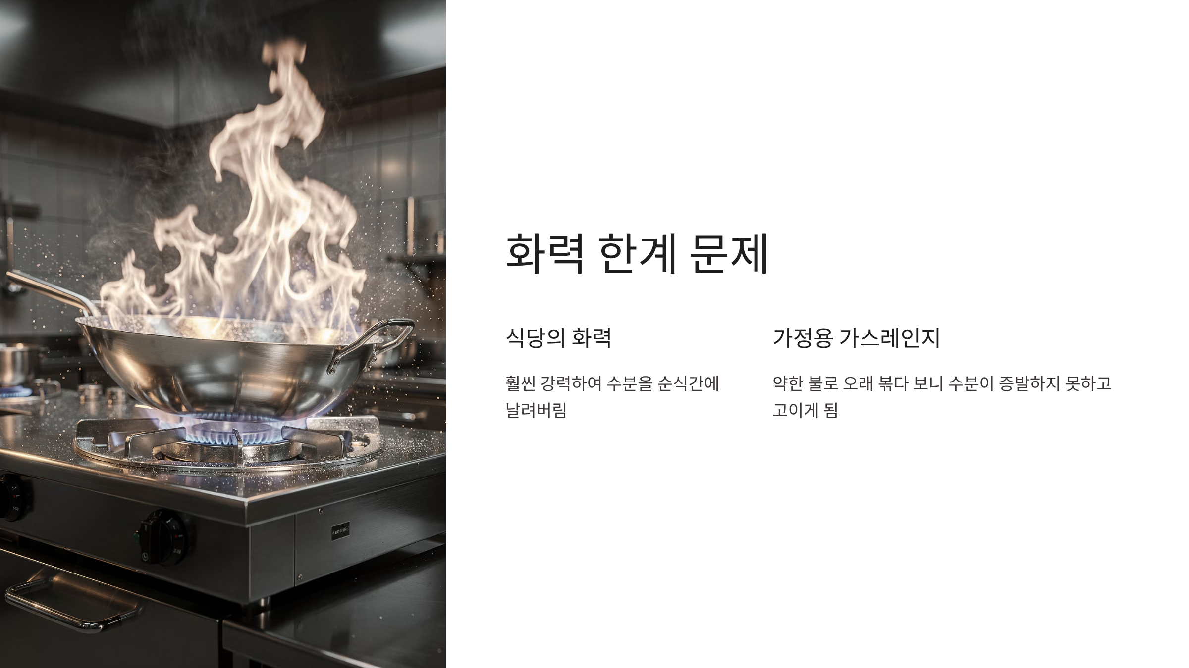 가정용 가스레인지의 화력 한계: 식당의 화력은 가정용보다 훨씬 강력하여 수분을 순식간에 날려버리지만, 집에서는 약한 불로 오래 볶다 보니 수분이 증발하지 못하고 고이게 됩니다.