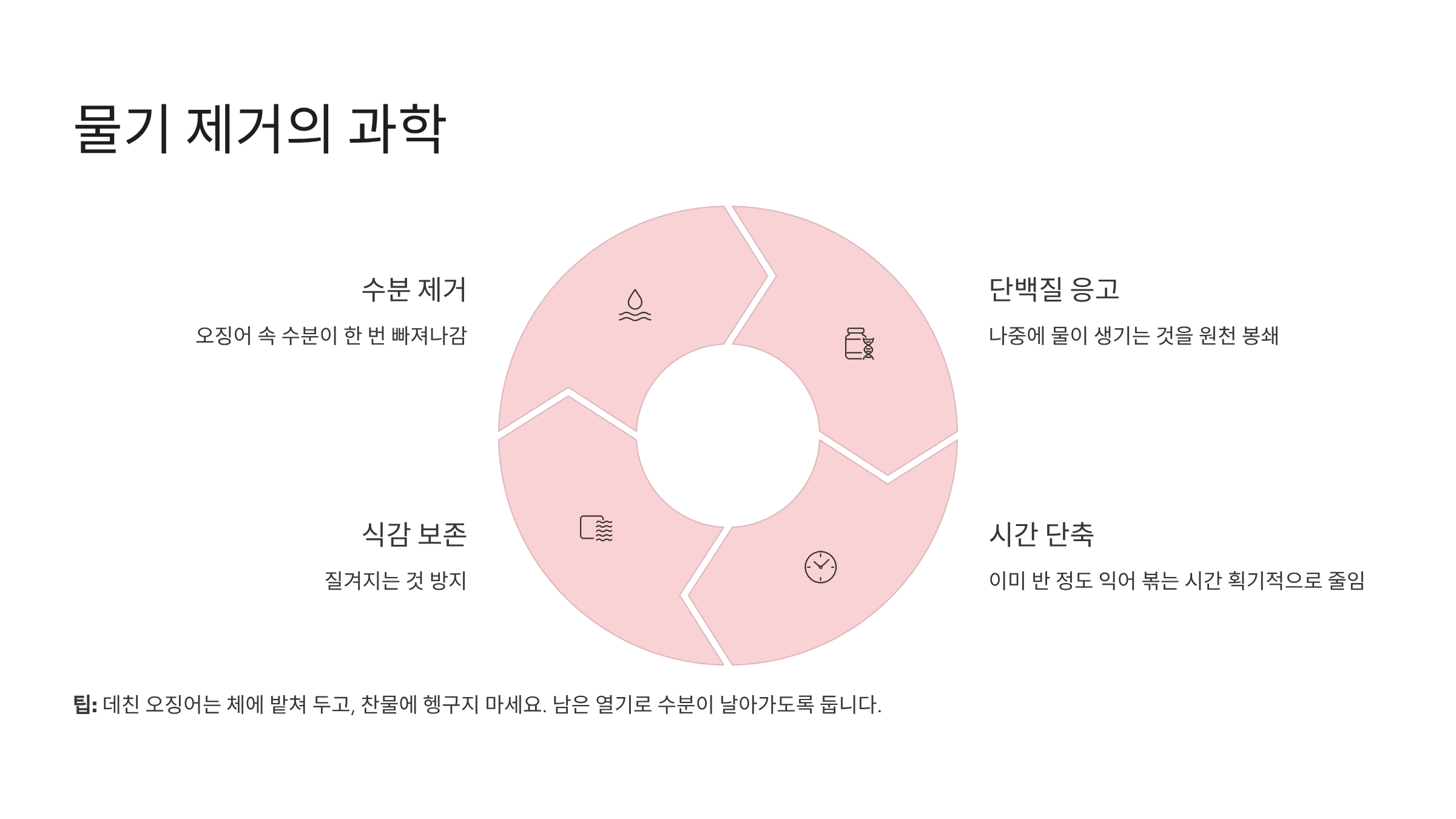 본격적인 레시피에 앞서 왜 우리가 만들면 물이 생기는지 원인부터 파악해야 합니다. 오징어와 채소는 수분 함량이 매우 높은 식재료입니다. 조리 과정에서 열을 가하고 삼투압 현상이 발생하면 식재료 속의 수분이 밖으로 빠져나오게 됩니다.