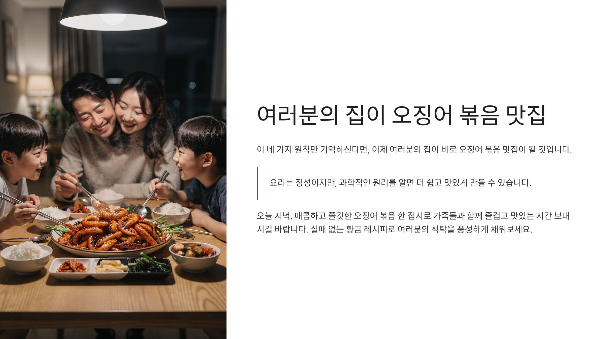 이 네 가지 원칙만 기억하신다면, 이제 여러분의 집이 바로 오징어 볶음 맛집이 될 것입니다. 요리는 정성이지만, 과학적인 원리를 알면 더 쉽고 맛있게 만들 수 있습니다. 오늘 저녁, 매콤하고 쫄깃한 오징어 볶음 한 접시로 가족들과 함께 즐겁고 맛있는 시간 보내시길 바랍니다. 실패 없는 황금 레시피로 여러분의 식탁을 풍성하게 채워보세요.