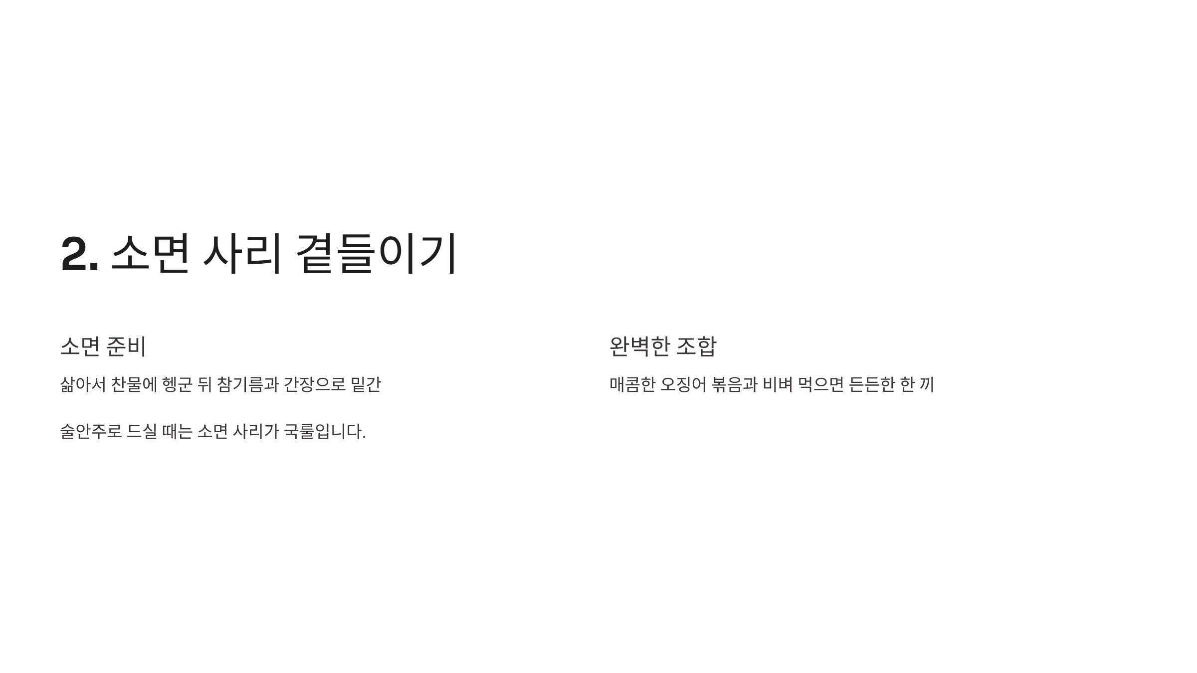 술안주로 드실 때는 삶은 소면을 곁들이는 것이 국룰입니다. 소면을 삶아 찬물에 헹군 뒤 참기름과 간장으로 살짝 밑간해서 접시 한쪽에 담아보세요. 매콤한 오징어 볶음과 비벼 먹으면 든든한 한 끼 식사로도 손색이 없습니다.