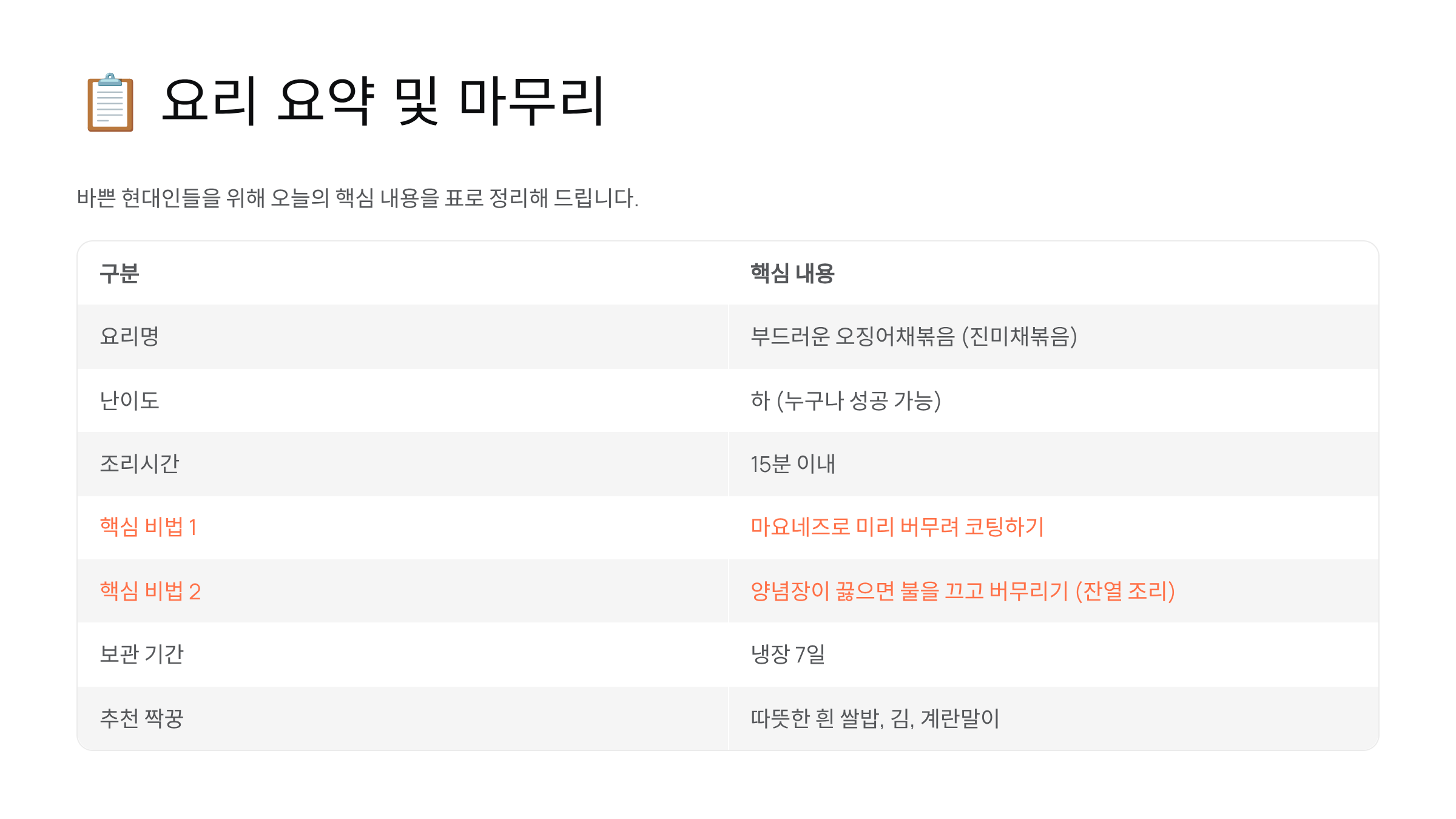 바쁜 현대인들을 위해 오늘의 핵심 내용을 표로 정리해 드립니다.