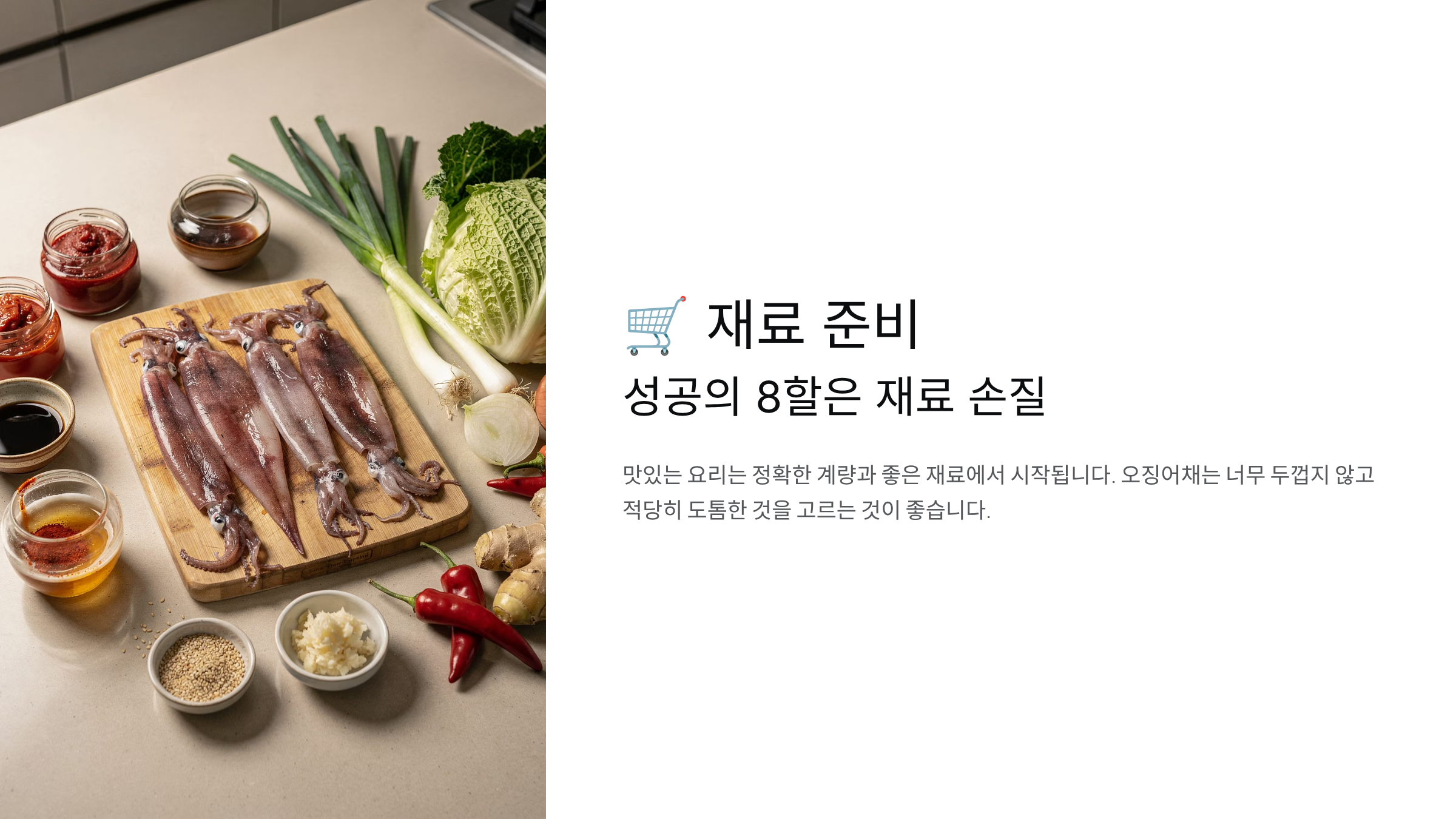 맛있는 요리는 정확한 계량과 좋은 재료에서 시작됩니다. 오징어채는 너무 두껍지 않고 적당히 도톰한 것을 고르는 것이 좋습니다.