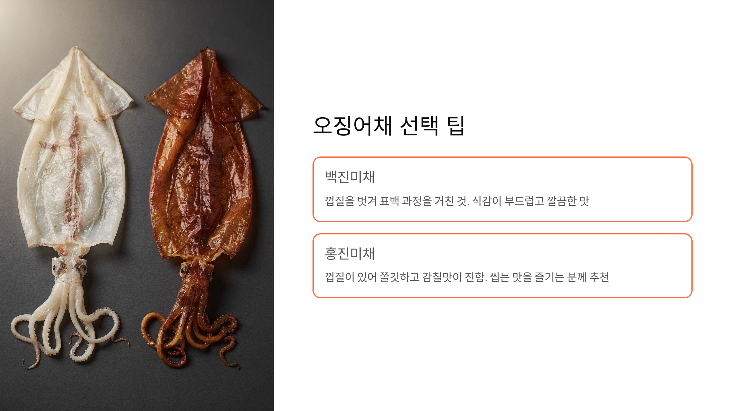 시중에는 백진미채와 홍진미채가 있습니다. 백진미채는 껍질을 벗겨 표백 과정을 거친 것이 많아 식감이 부드럽고 깔끔한 맛을 내며, 홍진미채는 껍질이 있어 쫄깃하고 감칠맛이 진합니다. 부드러운 반찬을 원하신다면 백진미채를, 씹는 맛을 즐기신다면 홍진미채를 추천합니다. 최근에는 표백하지 않은 내추럴 진미채도 있으니 건강을 생각하신다면 성분표를 확인해 보세요.