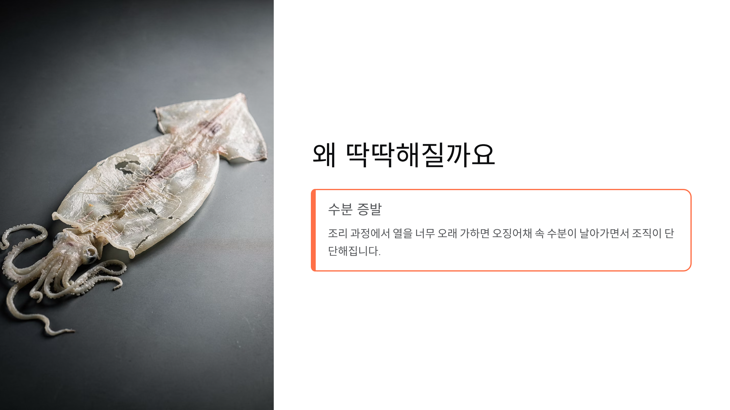 첫째, 수분 증발입니다. 조리 과정에서 열을 너무 오래 가하면 오징어채 속에 남아있던 수분이 날아가면서 조직이 단단해집니다.