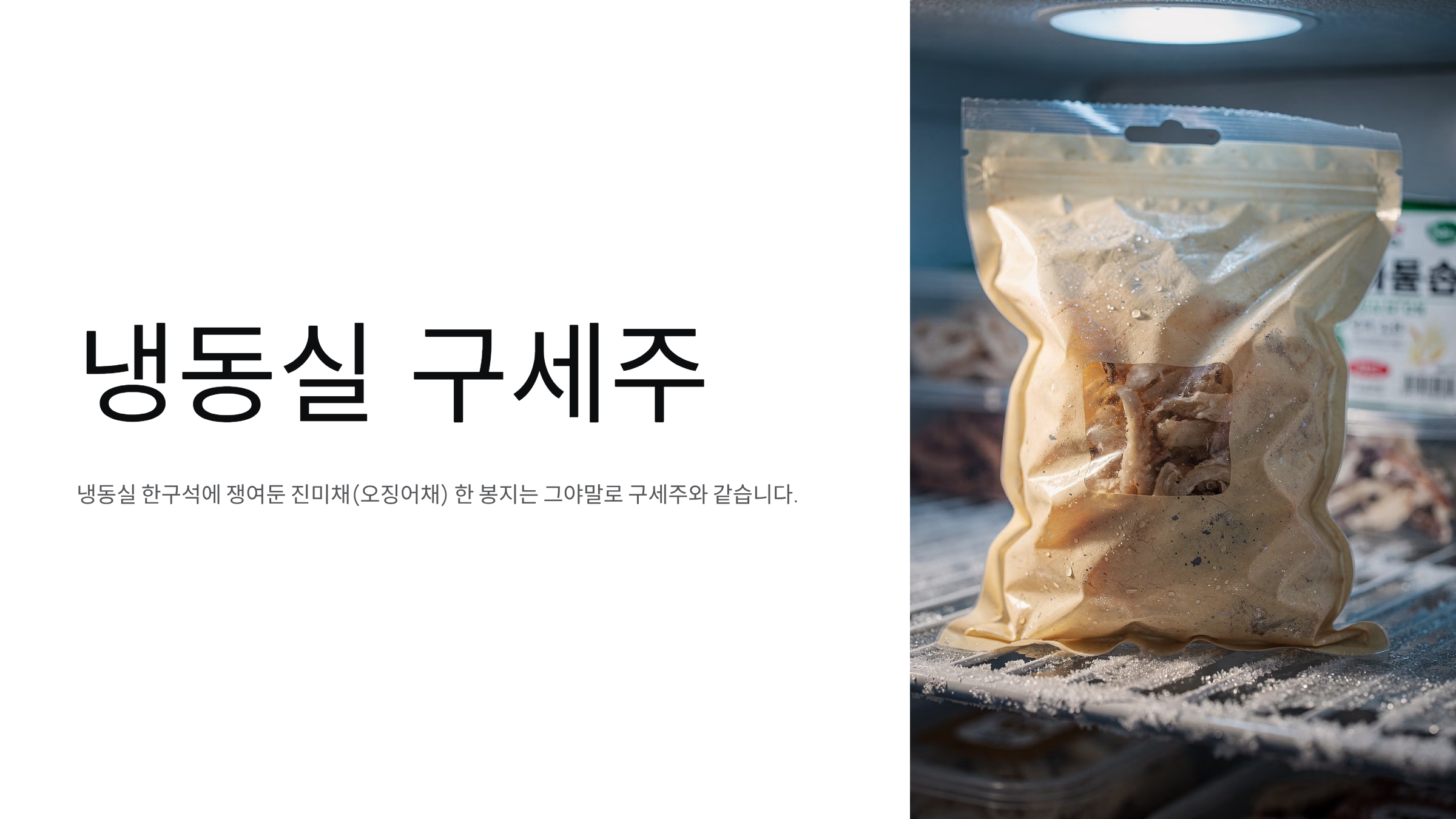 A. 오래된 오징어채에서는 냉동실 냄새나 쩐내가 날 수 있습니다. 이럴 때는 전처리 과정에서 물에 헹굴 때 소주나 청주를 소주잔으로 한 컵 정도 부어 헹궈주세요. 알코올이 증발하면서 잡내를 함께 가져갑니다. 그 후 마른 팬에 양념 없이 오징어채만 살짝 덖어 수분을 날려주면 냄새가 사라집니다.
