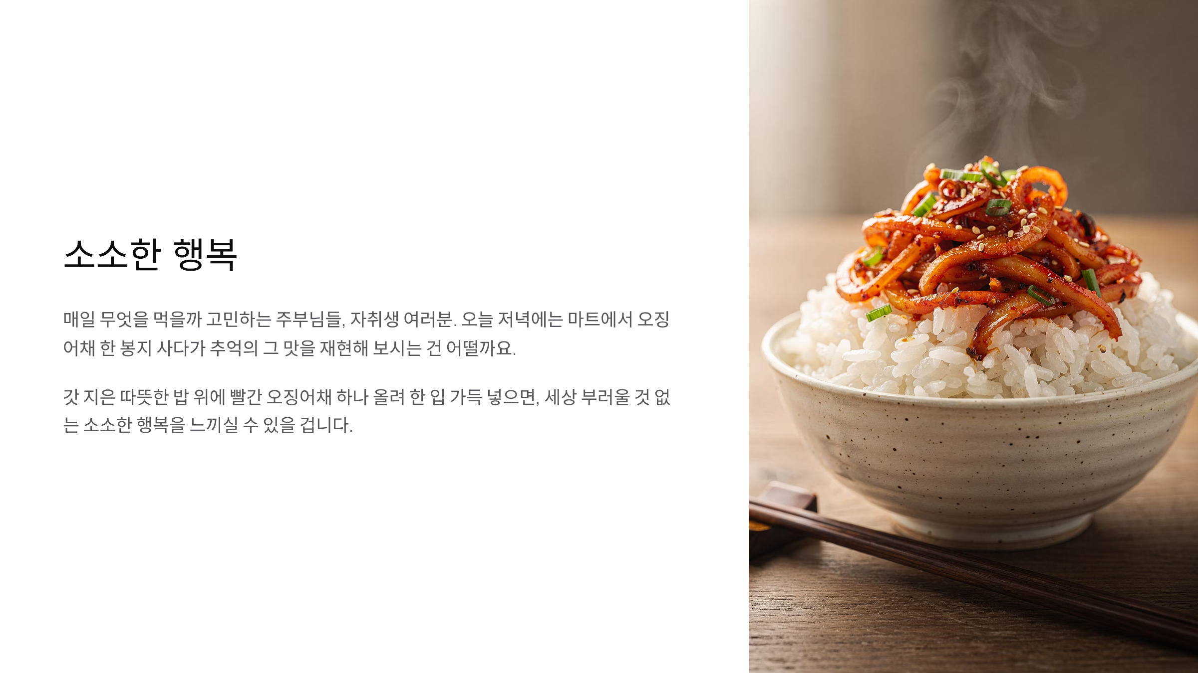 매일 무엇을 먹을까 고민하는 주부님들, 자취생 여러분. 오늘 저녁에는 마트에서 오징어채 한 봉지 사다가 추억의 그 맛을 재현해 보시는 건 어떨까요. 갓 지은 따뜻한 밥 위에 빨간 오징어채 하나 올려 한 입 가득 넣으면, 세상 부러울 것 없는 소소한 행복을 느끼실 수 있을 겁니다. 정성이 담긴 반찬 하나가 가족의 하루를 든든하게 채워줍니다. 맛있는 식사 하세요.
