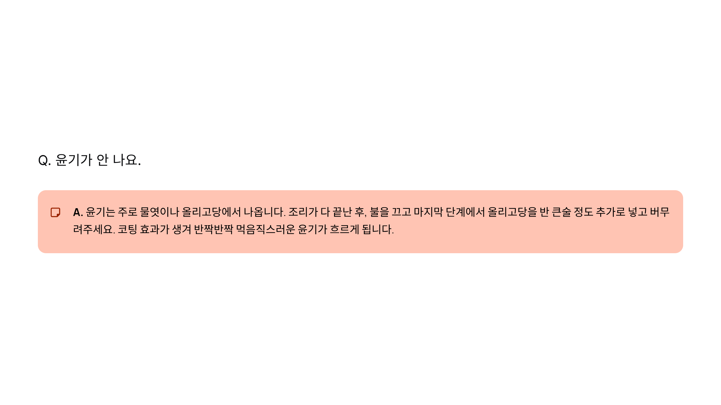 A. 윤기는 주로 물엿이나 올리고당에서 나옵니다. 조리가 다 끝난 후, 불을 끄고 마지막 단계에서 올리고당을 반 큰술 정도 추가로 넣고 버무려주세요. 코팅 효과가 생겨 반짝반짝 먹음직스러운 윤기가 흐르게 됩니다.